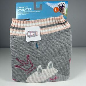 NEW Dog Princess Llama Grey & Pink Knit Sweater. Size Large. Very comfortable, knit with holes for doggies front legs. This is a grey sweater with a white llama with a princess crown and hearts with the printed word ‘Princess’. Collar and bottom hem of sweater have a peach, white and grey striped detailing. Please see tag pictures for measurements based on breed. This is new with tags.