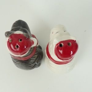 NEW Dog Salt & Pepper Shakers Holiday Santa Hat Black White Ceramic Puppies
