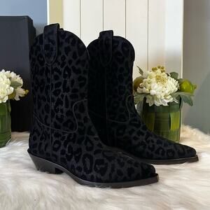 Brand New Dolce & Gabbana Leopard Print Cowboy Midi Gaucho Boots in Timeless Black Leather & Velvet Outer with Subtle Shimmery Silver Metallic Detailing Throughout. Low Square Heel and Elongated Snub Toe. Women's Size 35 EUR.