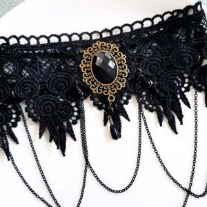 Dolls Kill Delicate Fate Lace Choker the future isn't as clear as you wish. This haunting choker that has a thicc lace construction, draping chain design, large jewel pendant and adjustable clasp closure.