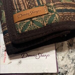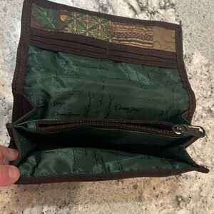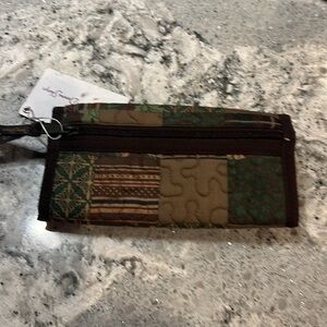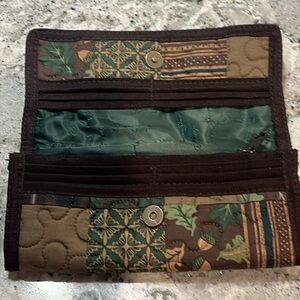Brown quilted patchwork wallet by Donna Sharp in green and brown tones. Ideal for daily use.