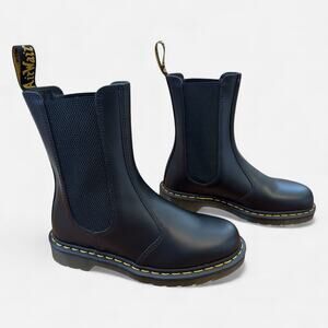 The classic Dr. Martens Chelsea Hi Smooth Leather boots stay true to the decades-old design with yellow welt stitching and a scripted AirWair heel loop. This retired style is highly sought after but tough to find. This pair is NEW, never worn, and in a Women's Size 8, Men's Size 7.