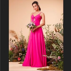 The knot at the neckline creates a captivating keyhole to begin this beguiling gown that finishes with a flowing front-slit skirt.