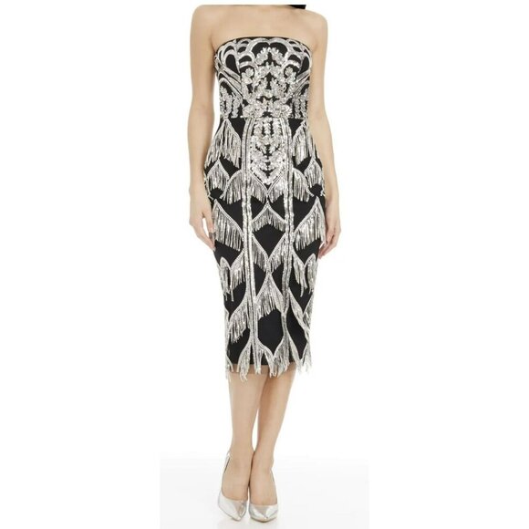 The Viviana is a captivating strapless bustier midi bodycon dress, adorned with fringe details that add a playful and elegant flair to your ensemble.