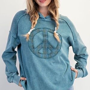 NEW EASEL CLOTHING WASHED TERRY KNIT PULLOVER PEACE HOODIE TEAL SWEATSHIRT