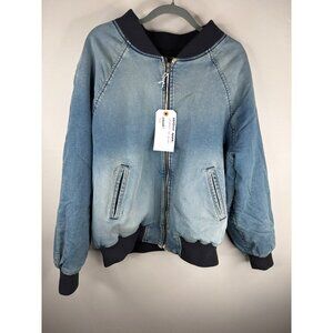 EB Denim's Lombardi denim zip bomber jacket features rib-knit trim at cuffs, hem, and neckline, quilted lining interior, and intentionally faded detailing.