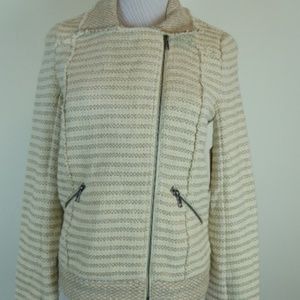NEW ELLA MOSS ZIP FRONT MOTO JACKET, size small, cotton/poly/stretch blend, beige(light camel) ivory tweed, full zip..fringe detail..unlined