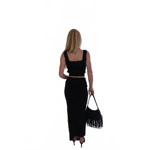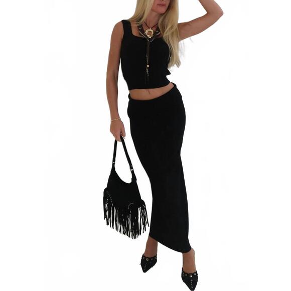- Description: Introducing The Selene Set by Et Clet, a chic two-piece ensemble in classic black, perfect for vacation styling. This set features a tank top and a maxi skirt with a fold-over waistband detail, crafted from a stretchy, soft knit fabric offering comfort and versatility. The solid pattern and pull-on closure make it a go-to choice for effortless elegance. Care: Hand wash.