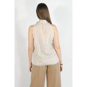 Flared tank top with America neckline. Gathered collar with keyhole closure and small buttons on the back. Doubled edge on the bottom. Regular fit. Length 24". Hand wash cold. 82% Lyocell, 18% Polyamide.