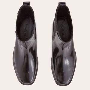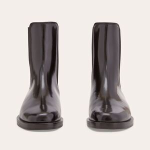This piece features a classic Chelsea silhouette, side elastic, welting detail with soft square toe, and padded insole for comfort in thick leather with an elevated shine.