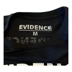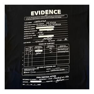 • Black t-shirt with the word "EVIDENCE" printed in white block letters across the chest. The back of the shirt features a graphic resembling an evidence tag, containing fields for information such as case number, suspect's name, date, and chain of custody