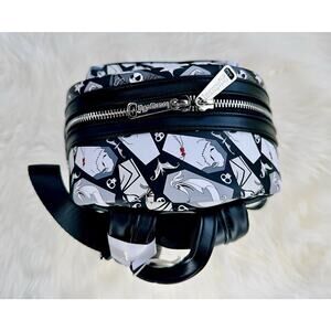 Introducing the Loungefly NBC XMAS COFFIN AOP Mini Backpack, the perfect accessory to add a dash of spooky holiday style to your wardrobe! This backpack showcases a stunning all-over print featuring beloved characters from Tim Burton's The Nightmare Before Christmas, making it an ideal choice for fans of the iconic film. Its unique coffin-shaped design and festive Christmas motif give it a one-of-a-kind charm, making it a standout piece for your holiday gatherings. Crafted with Loungefly's signature attention to detail and quality, this mini backpack is not only stylish but also practical, with multiple pockets to keep your essentials organized. Embrace the holiday spirit with this hauntingly beautiful accessory that pays homage to the Halloween and Christmas traditions of Halloweentown!