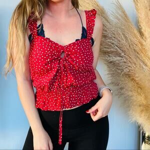 NEW EXPRESS Red White Polka Dot Ruffle Tank Top Peplum Keyhole Tie Crop Shirt XS