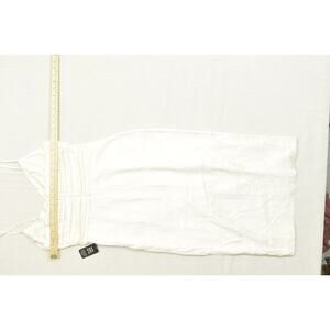 This Express mini dress is the perfect addition to any wardrobe, new with tags attached. The dress is a size 10 and features a cream color with a subtle floral pattern throughout. The sleeveless style and spaghetti straps are perfect for warm weather or layering. The dress has a flattering V-neck, a pleated bodice, and a side slit for added style and movement. The material is a comfortable blend of 50% rayon and 50% polyester with a 100% polyester lining. The dress is in new condition with original tags, and the measurements are 16 inches armpit to armpit and 35 inches length. This dress is suitable for various occasions and is a stylish and versatile piece.