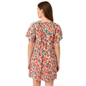This dress is a colorful floral print mini-dress with a relaxed, comfortable fit.
