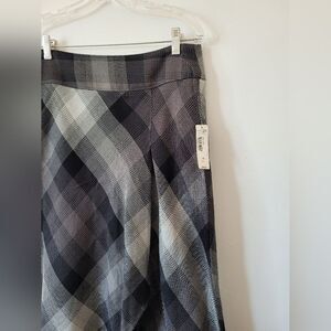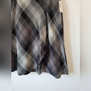 New with tags skirt in a timeless checked plaid print. Back zip closure. Flattering middle Ruffled slit in front making an assymetric effect. Size 10, measures approximately 30 inches long 32 inch waist.