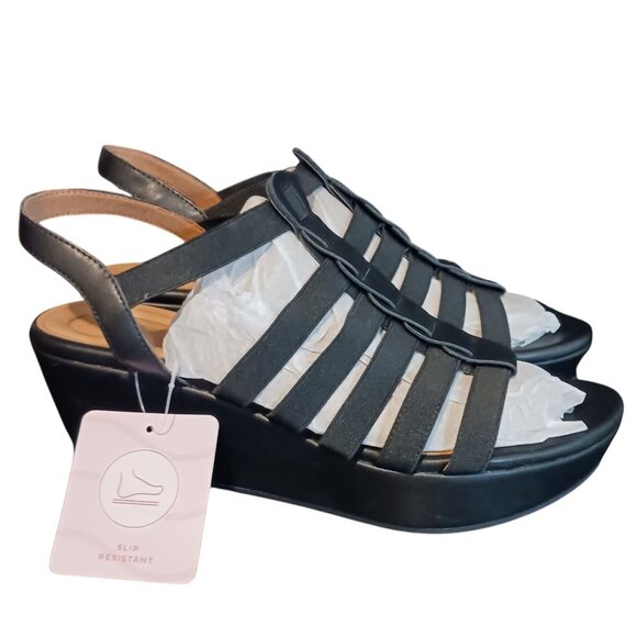 Keywords: wedge sandals, black sandals, platform wedge, strappy sandals, faux leather shoes, Easy Spirit, size 10, women's footwear, summer shoes, stylish wedges, comfortable sandals, open toe, casual sandals