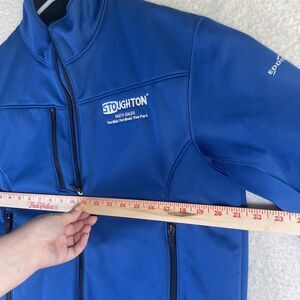 This Eddie Bauer Stoughton Parts Weather Resist Soft Shell Work Jacket is a versatile piece perfect for casual wear or workwear. Made of lightweight and breathable softshell fabric, this jacket features a full zip closure and a stand-up collar style. The blue jacket has a solid pattern with embroidered logo accents, and is available in a men's regular fit size medium with a chest size of 43 inches.