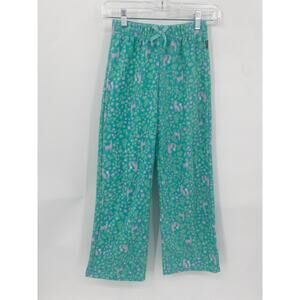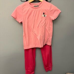 * Bottom: straight leg pant with pink non-functional drawstring and all over bear and tree print