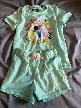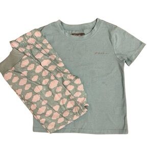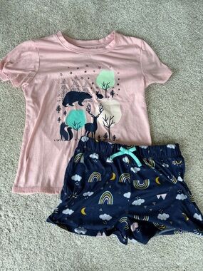 * Bottom: straight leg pant with pink non-functional drawstring and all over bear and tree print