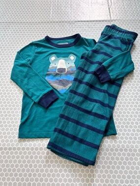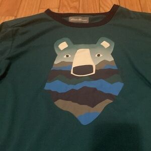 * Top: all over bear and tree print with blue trim detailing on neck and wrists