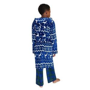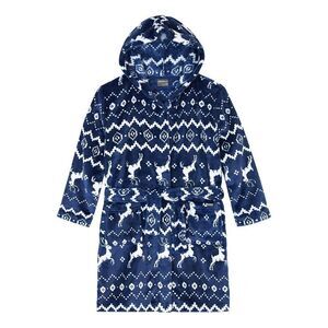 * Robe: navy blue deer print plush robe with wrap tie and hood