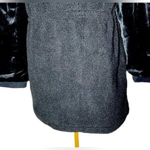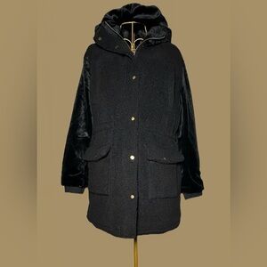NEW Eden Society Sherpa Black Coat with Contrasting Super Soft Faux Fur Sleeves & Hood, Quilted Lining, Front Zipper and Snaps, Inside Waist Drawstrings, 2 Front Slanted Chest Pockets, and 2 Front Large Snap Pockets, Size Medium.
