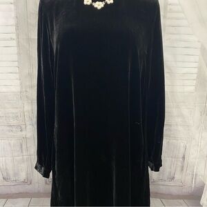 Eileen Fisher Size XS Black Silk Crew Neck Dress Pockets Long Sleeve Velvet