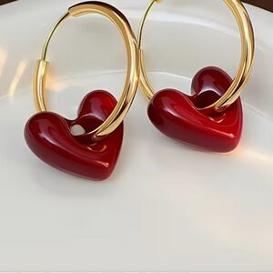 ♥️ NEW Goldtone stainless steel hoops with shiny red hearts. Posts backs hypoallergenic. Add a touch of romance to your look with these elegant red heart hoop earrings. Perfect for any occasion ♥️