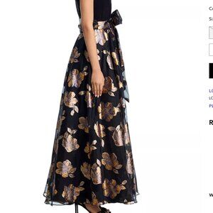 NWOT Elegant maxi dress with a black top and gold floral skirt. Sleeveless design. Perfect for formal occasions.