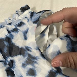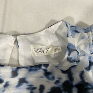 Eliza J. blue leopard print cold shoulder dressSoft and flowy; fully lined; fit and flare style; ruffle details at neck, shoulders, cuffs, and hem; button keyhole closure at nape; abstract blue and white animal print. This dress is so cute, girly, and flirty!