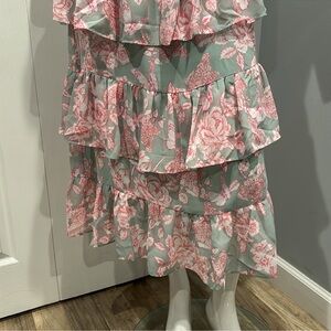Absolutely beautiful for any spring or summer event! So flowy and has great movement when you walk. Hoping to find it a happy home because it really is stunning. The color combination is my favorite. The green and the pink is so pretty and the ruffles and bow in the back are lovely. Zippered up bodice. Brand new never worn.