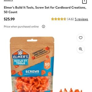 • Construct and create with cardboard! Elmer's 50-Count Screw Pack helps you transform cardboard into extraordinary creations • Build a castle, a robot, an airplane, or anything you can imagine out of cardboard • Creates fun crafts for kids ages 6 and up • Allows you to easily connect up to 2 pieces of cardboard with the Elmer's Build It Tools Screwdriver and Hole punch • Can be unscrewed in order to be used for other creations • 50 count, cardboard not included