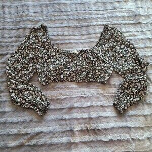 Pretty and feminine Elodie long sleeve floral cropped top with balloon sleeves and elastic at the wrist and waist with a tie front, size medium.
