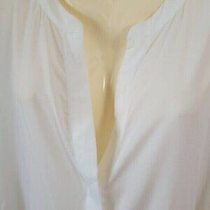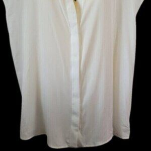 White, sleeveless, chiffon-type fabric, very flowy. The front has a hidden placket over the buttons and a split neck. Cap sleeves.