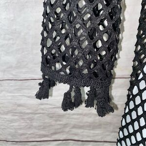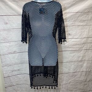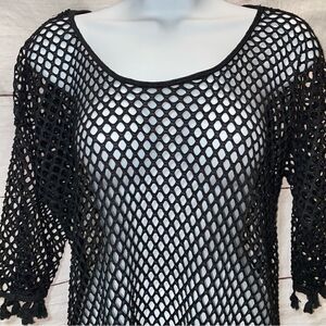New with tags! Fun fishnet cover up has 3 quarter sleeves, tassels, and splits. 100% Polyester. Machine washable. No holes or flaws.