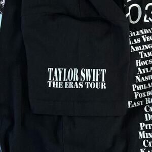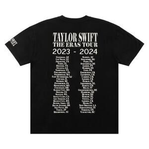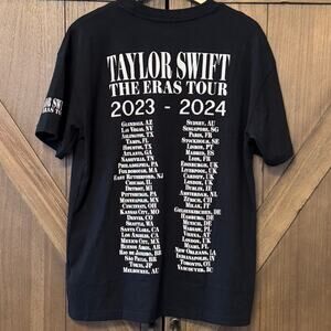 Black t-shirt featuring photos of Taylor Swift printed on front and "Taylor Swift The Eras Tour" printed on wearer's left sleeve with "Taylor Swift The Eras Tour 2023-2024" and tour locations printed on back.