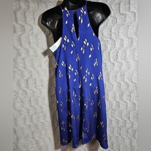 New with tags from Stitch Fix Everly brand Andra Dress style in cobalt blue with gold abstract brush strokes. Fully lined dress with tent sheath style and halter neck with a keyhole opening in back. Size small, flat lay measurements: chest 17.5", length from armpit 26".