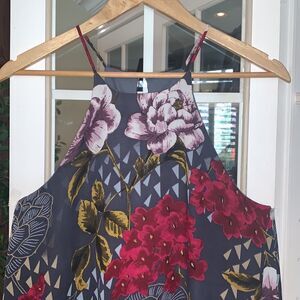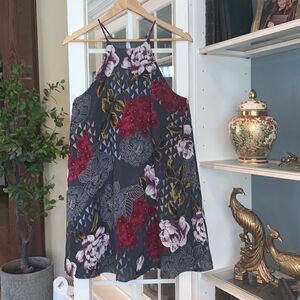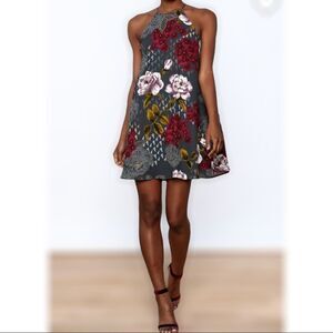 Everly dress Halter style sleeveless mini dress — Gray floral— keyhole & 1-button closure in the back of neck — lined — Perfect for summer