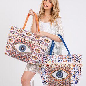 NEW Evil Eye Boho Print Pom Pom Boho Fringe Tote Bag Handbag Bohemian Style