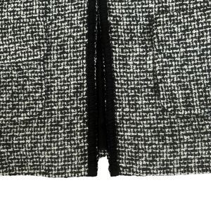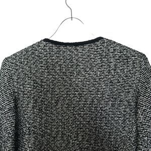 Black and white tweed. Front functional pockets with flap closure. One clasp in front. Lined. 3/4 sleeves. Cropped.