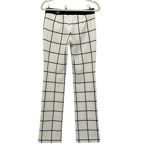 Express Editor Barley Boot Trousers - MSRP: $79.90 - Straight leg dress pants trousers - shade of ivory / off-white with a black checker windowpane pattern. Button, clasp & zipper closure. 2 front pockets. Straight through hip & leg. Material has a stretch. Polyester Blend.