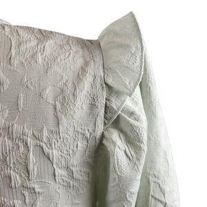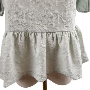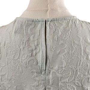 A beautiful and feminine blouse for church, parties, or the office. Wear with dressy pants or skirt or jeans. The color is a very pale green and has a raised design throughout the blouse.