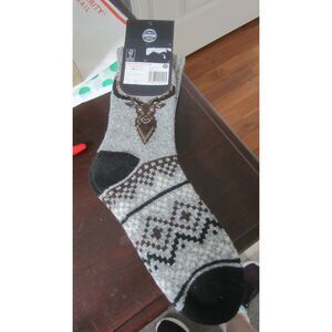 GRAY SOCKS WITH DEER. ( HAPPY HUNTING ) WOOL BLEND. FITS MENS 8-12