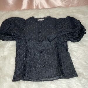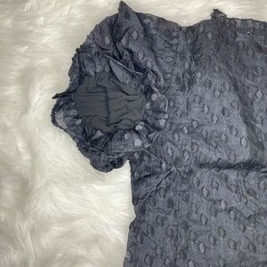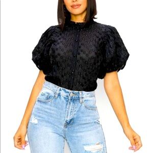 A black knit jacquard dot top featuring a mock neckline, button-up closure, short bubble sleeves, and a waist-length.