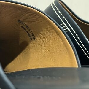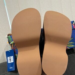 These FARM Rio clog platform mules feature a striking combination of black leather with intricate heart designs, The slip-on design and slightly raised wooden heel provide comfort and a touch of elegance.