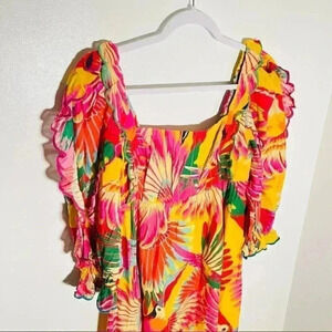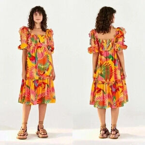 Description: Bring the tropics with you wherever you go in this eye-catching FARM Rio Colorful Toucans Midi Dress—a playful, feel-good piece bursting with vivid color and standout details. Featuring a bold toucan print and delicately scalloped trim, this dress radiates vacation mode energy even if you're just headed to brunch. The fit is easy and breezy with a flattering midi length and a touch of whimsy thanks to the scalloped hem. Perfect for travel, summer weddings, or just embracing joy in your everyday wardrobe.
