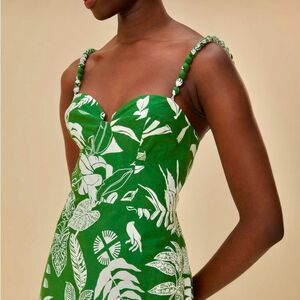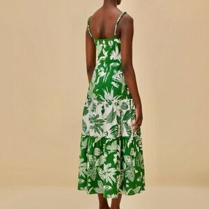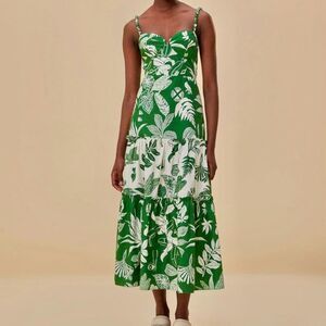 FARM Rio Forest Soul Mix Midi Dress Tropical Green White Tiered Size XL Color: green and white tropical print New with tags Embrace the playful spirit with our Forest Soul Mix Midi Dress. Featuring an invisible zipper at the back and a flattering sweetheart neckline, this dress effortlessly combines style and comfort. Perfect for any occasion, its unique Forest Soul print adds a touch of whimsy to your wardrobe. Tropical, whimsical print Sweetheart neckline Adjustable, detailed straps Empire waist Tiered skirt Invisible back zipper Chest 20” (elastic stretch) Empire waist 18.25” Length 53” (adjustable straps) 100% cotton Machine wash 1582 Tags: FARM Rio Brazil luxe boho chic tropical whimsical cotton fit and flare sun dress summer vacation travel party date casual luxury designer