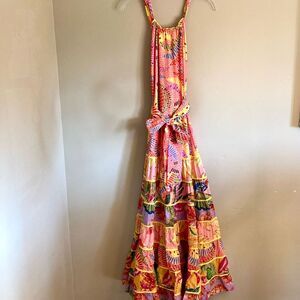 NEW FARM Rio Mixed Pink Prints Maxi Dress Fruit Tiered Crossback Belt Size L