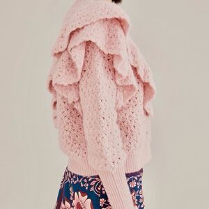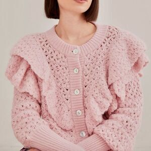 FARM Rio Pink Flower Texture Knit Cardigan Sweater Button Ruffle